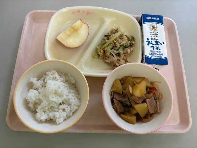 ごはん、牛乳、肉じゃが、大豆サラダ、りんごです。