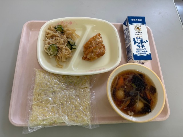 ワンワンラーメン、牛乳、揚げぎょうざ、切り干し大根の中華和えです。