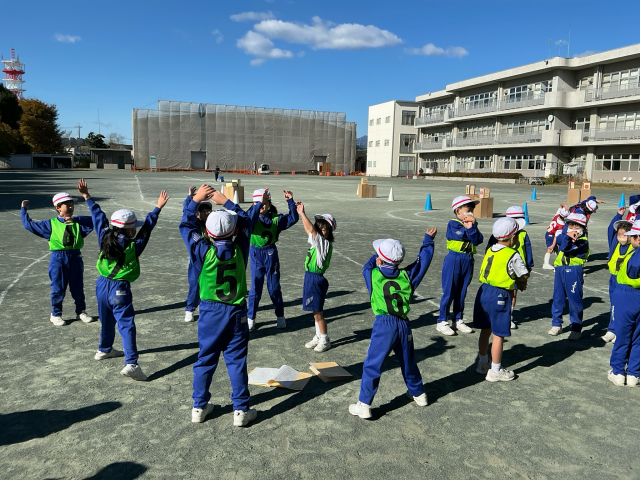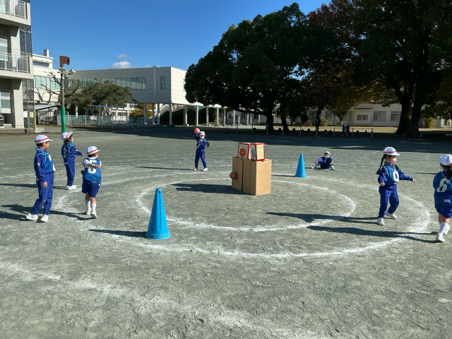 風が少し強くなり,寒さ感じる校庭ですが,子どもたちは段ボールの的に向かって元気よくボールを投げて楽しんでいます。