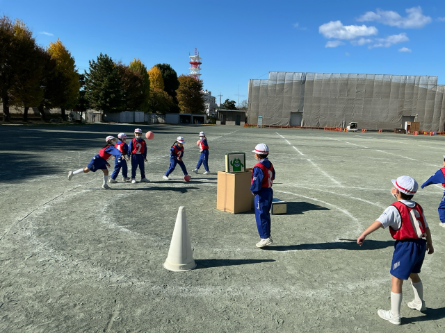 1年生は体育の授業で「ボールなげゲーム」に取り組んでいます。