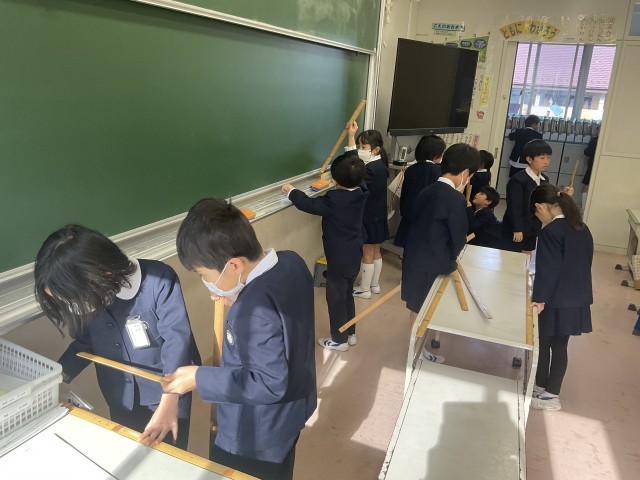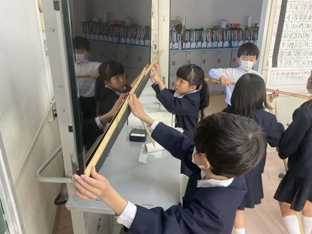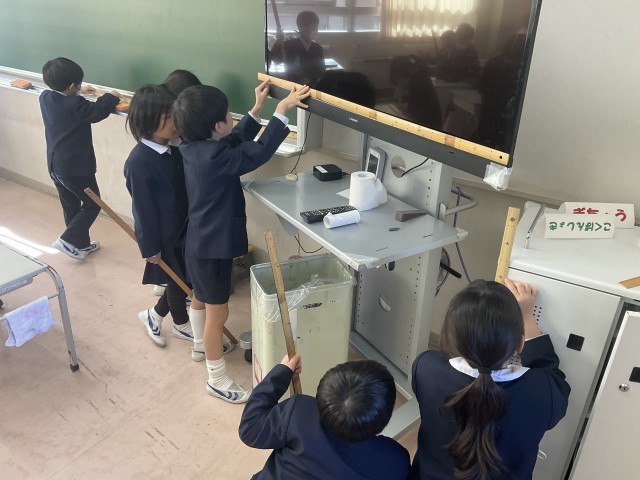 算数の「長いものの長さの単位」の学習で,教室内の物の長さを測る活動をしました。友達と端を揃えたり,物差しがズレないようにしたりと,協力して学習していました。