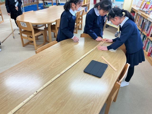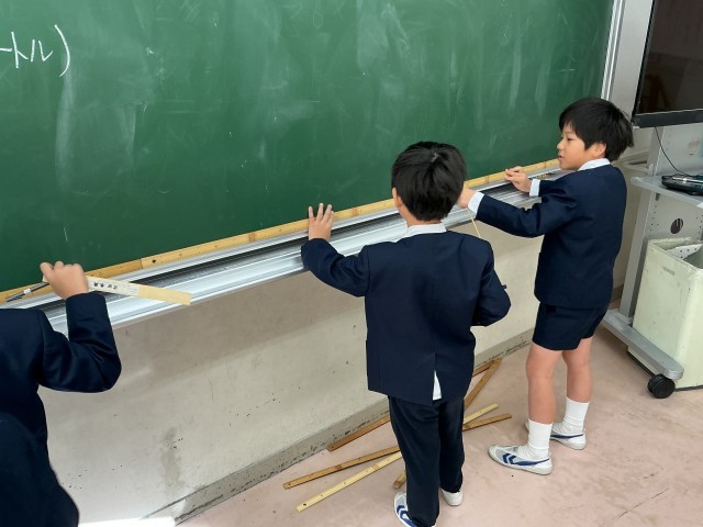 算数では「長いものの長さのたんい」の学習をしています。100cmが1mになることを確認した後,気になる長いものの長さを測りました。一人では難しいですが,友だちと協力する姿が見られました。