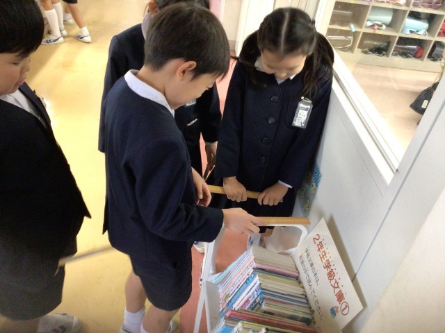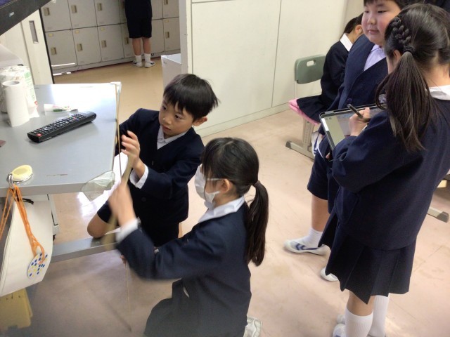 算数の「長いものの長さのたんい」の学習で,教室の中の模様替えを考えました。動かす物と動かす場所の長さを測り,動かせるかどうか考えていました。友達と協力して,楽しく学習できました。