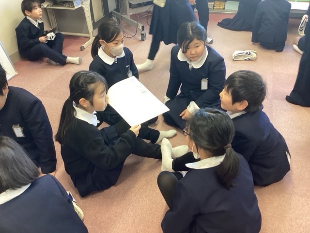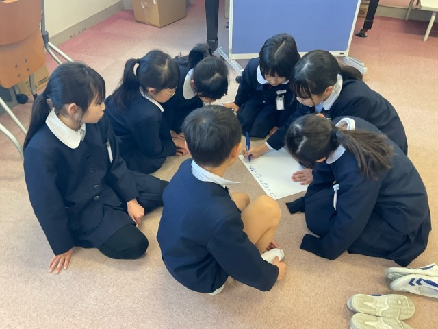 3クラス合同の4~7人グループで,「絵しりとりゲーム」に取り組みました。学年朝会係が考えた,話さず1人10秒以内にかく,というルールに従い,伝わる絵をすばやくかくことに挑戦し,それぞれのグループで笑顔が見られました。