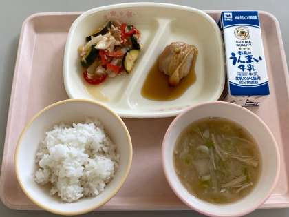 きょうの給食は,ごはん,牛乳,鶏の照り焼き,夏野菜の炒めサラダ,じゃがキム汁です。「鶏の照り焼き」と「夏野菜のいためサラダ」は新しいこんだてです。