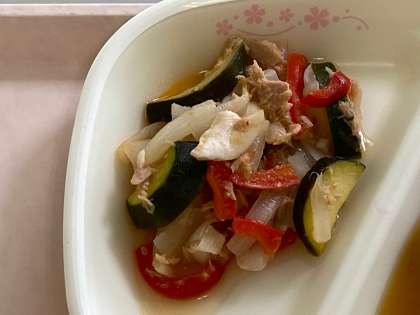 夏野菜の炒めサラダには,夏に旬をむかえるズッキーニ,パプリカが入っています。ツナ,玉ねぎ,エリンギといっしょにさっぱりとした味付けでソテーしました。ズッキーニは,形はきゅうりに似ていますが,かぼちゃのなかまです。イタリア語で「小さなかぼちゃ」を意味するそうです。ベータカロテンやビタミンCもふくんでいます。
