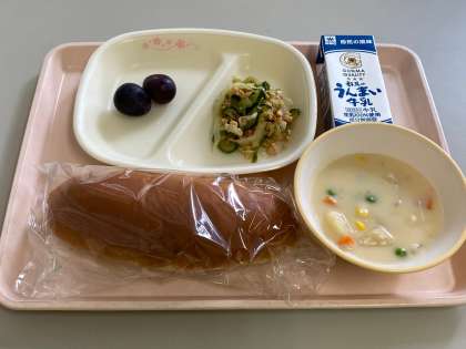 ミルクパン,牛乳,クリームシチュー,大豆サラダ,巨峰です。