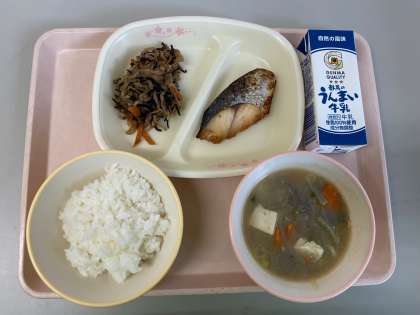 ごはん、牛乳、さわらの照り焼き、切り干し大根の煮物、豚汁です。