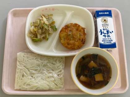 五目うどん,牛乳,かぼちゃとさつま芋のかき揚げ,おかかとじゃこの和え物です。