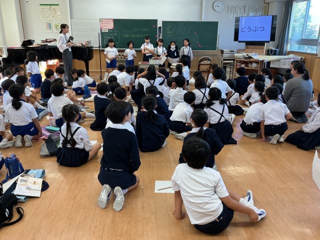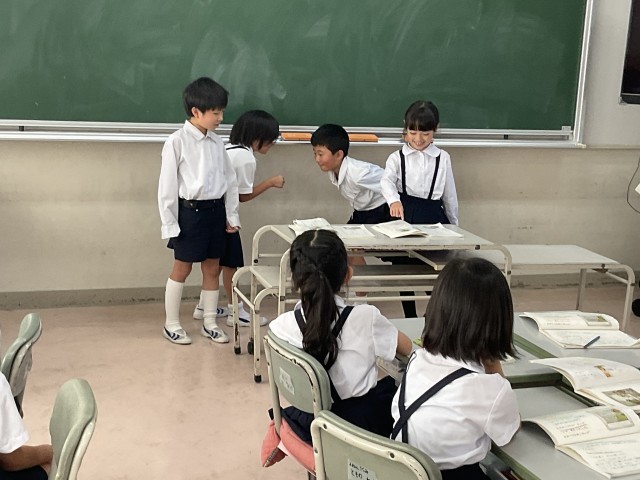 国語では,「お手紙」を読み,音読劇をするという学習課題を決め,取り組んできました。子どもたちは,登場人物の様子を想像して読んだことを音読劇に生かし,グループで話し合って練習した成果を発表していました。