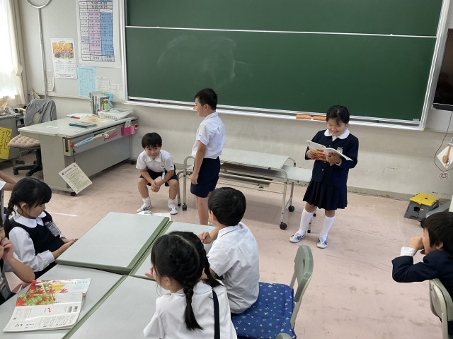 国語では,「お手紙」を読み,音読劇をするという学習課題を決め,取り組んできました。子どもたちは,登場人物の様子を想像して読んだことを音読劇に生かし,グループで話し合って練習した成果を発表していました。