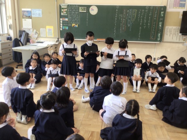 国語では,「ふきのとう」の学習をしています。竹藪の様子を思い浮かべたり,登場人物の気持ちを考えたりしました。学習のまとめとして行う音読劇に向けて,音読練習をしています。身振り手振りを加えたり,読み方の...